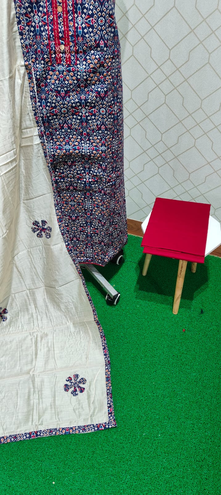 Superb quality both side ajrakh dyed cotton top with neat sequence and embroided neck pattern along with wooden buttons, cotton bottom, applique worked silk dupatta with tapings.