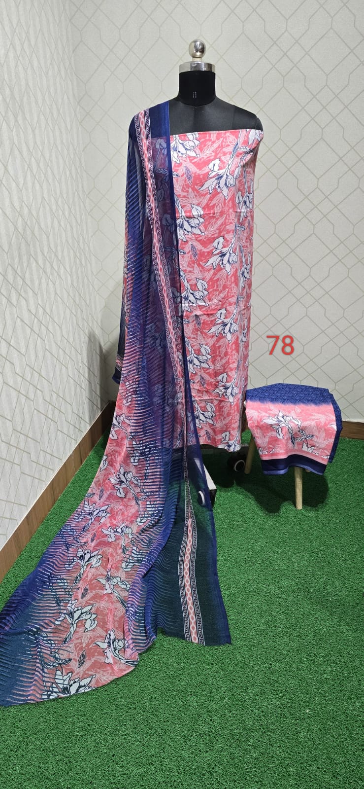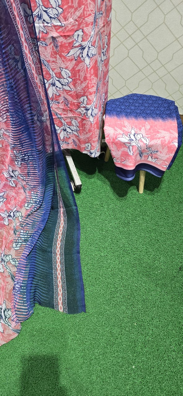 Both side printed crepe top, printed crepe bottom, chiffon dupatta with floral prints...