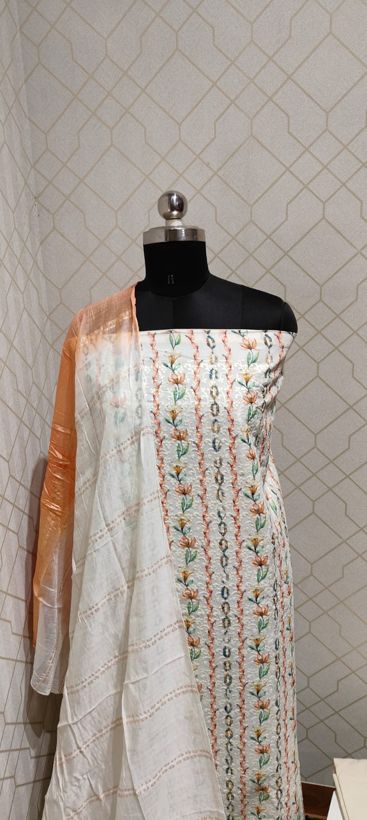 Rich looking Chikkankari worked pure cotton top floral prints, cotton bottom, premium silk dupatta with sequence and zari work.