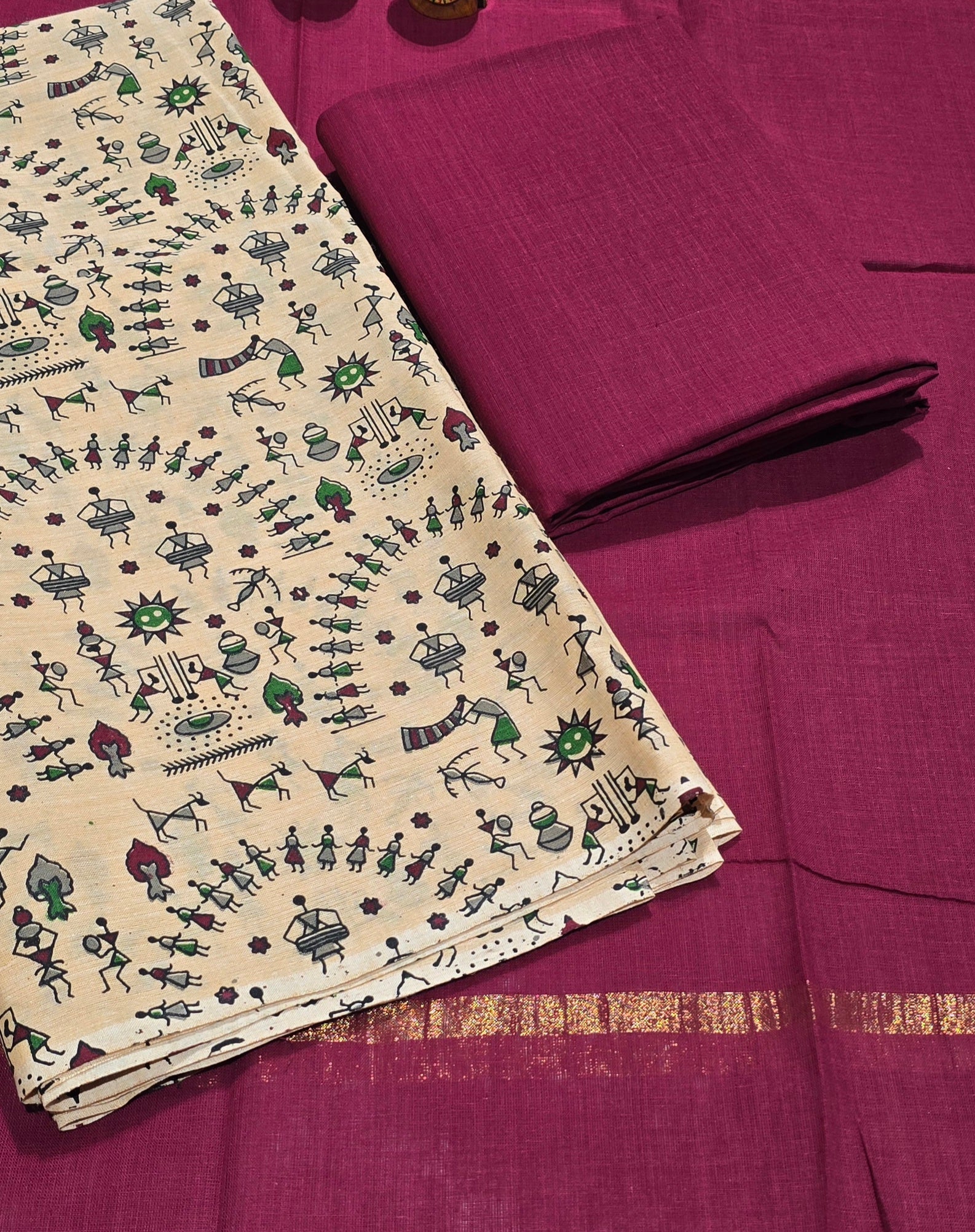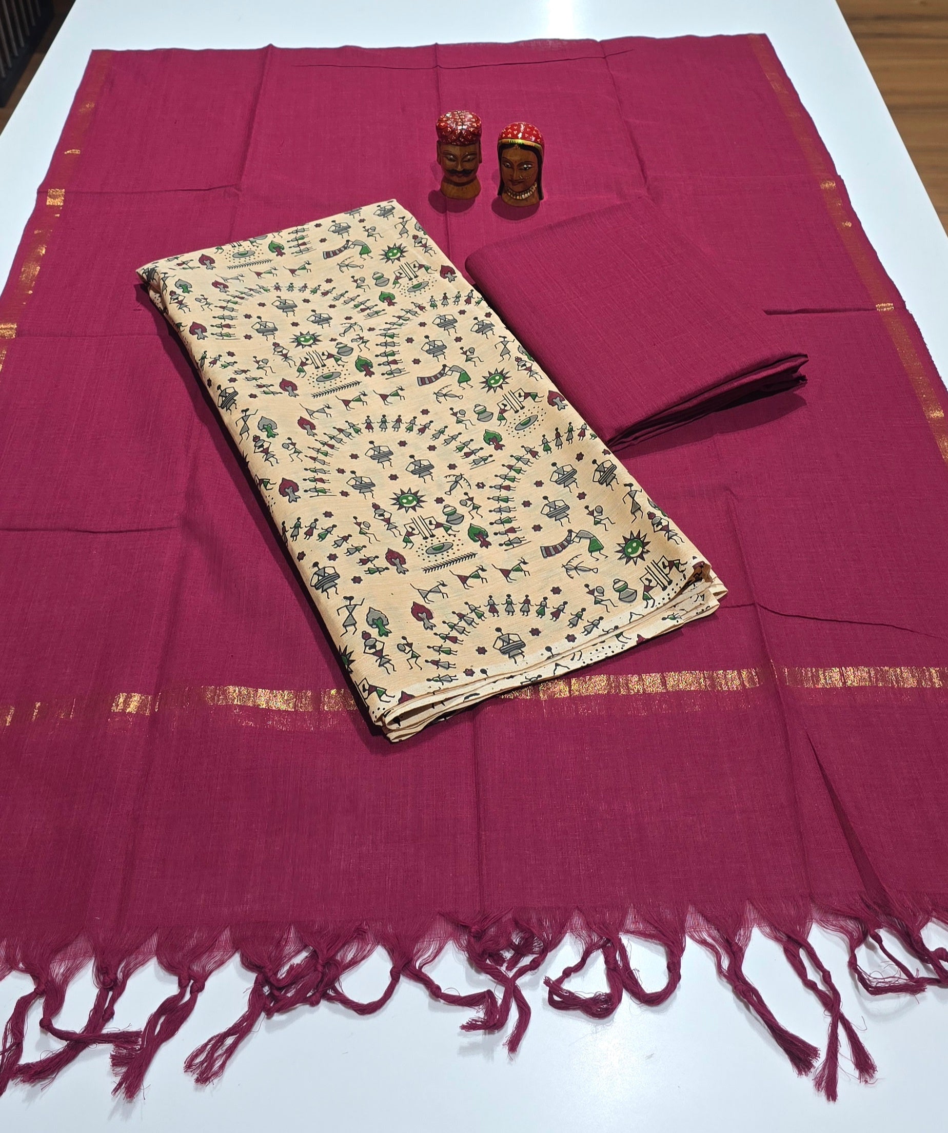 Superb quality 100% pure cotton top with both side warli prints, 100% pure pure cotton bottom, 100% pure cotton dupatta with zari borders and tassels..
