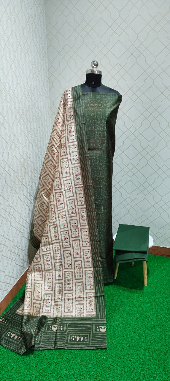 Both side warli printed geecha weaved semi tussar silk top with warli daman, cotton bottom, warli printed silk dupatta.